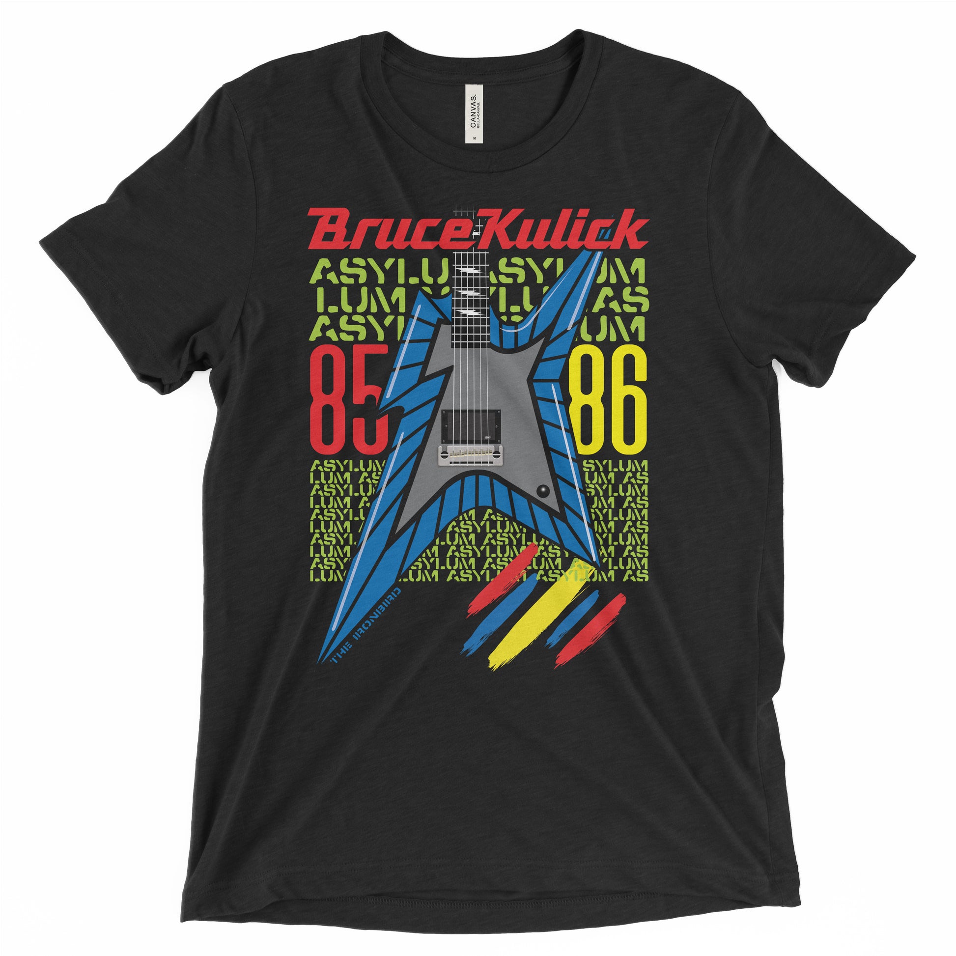 Hands down, one of Bruce's coolest guitars ever: The Blue Ironbird. A flashy, flamboyant period for the band, the KISS 1985-86 Asylum tour proved to be their most colorful ever including a 40-foot, multi-colored illuminated Kiss logo, yellow lightning bolt staircases, and over-the-top glittery outfits. The guitars for the Asylum tour were awesome, and none were quite like Bruce's Blue Ironbird. The guitar started off with a slightly oversized body, originally painted red. Not quite happy with the solid color result, Bruce asked for it to be painted from a drawing he created, another design he felt was modern, but classic. He requested the body be trimmed down from the original oversized shape, and chose colors of blue, and a black striped coordinating design. Hence, the Blue Ironbird took flight!