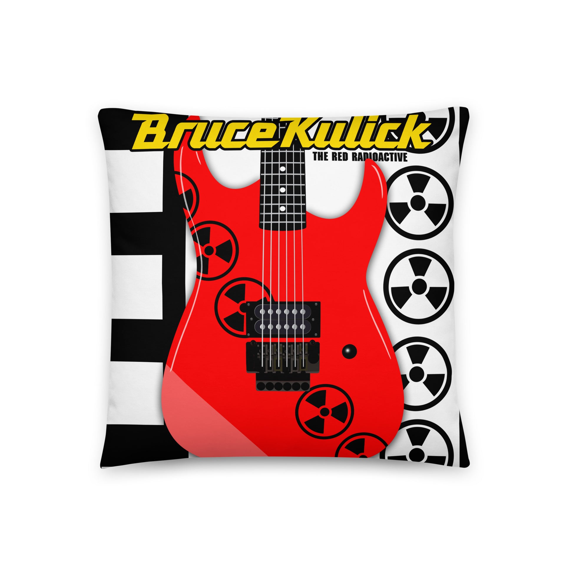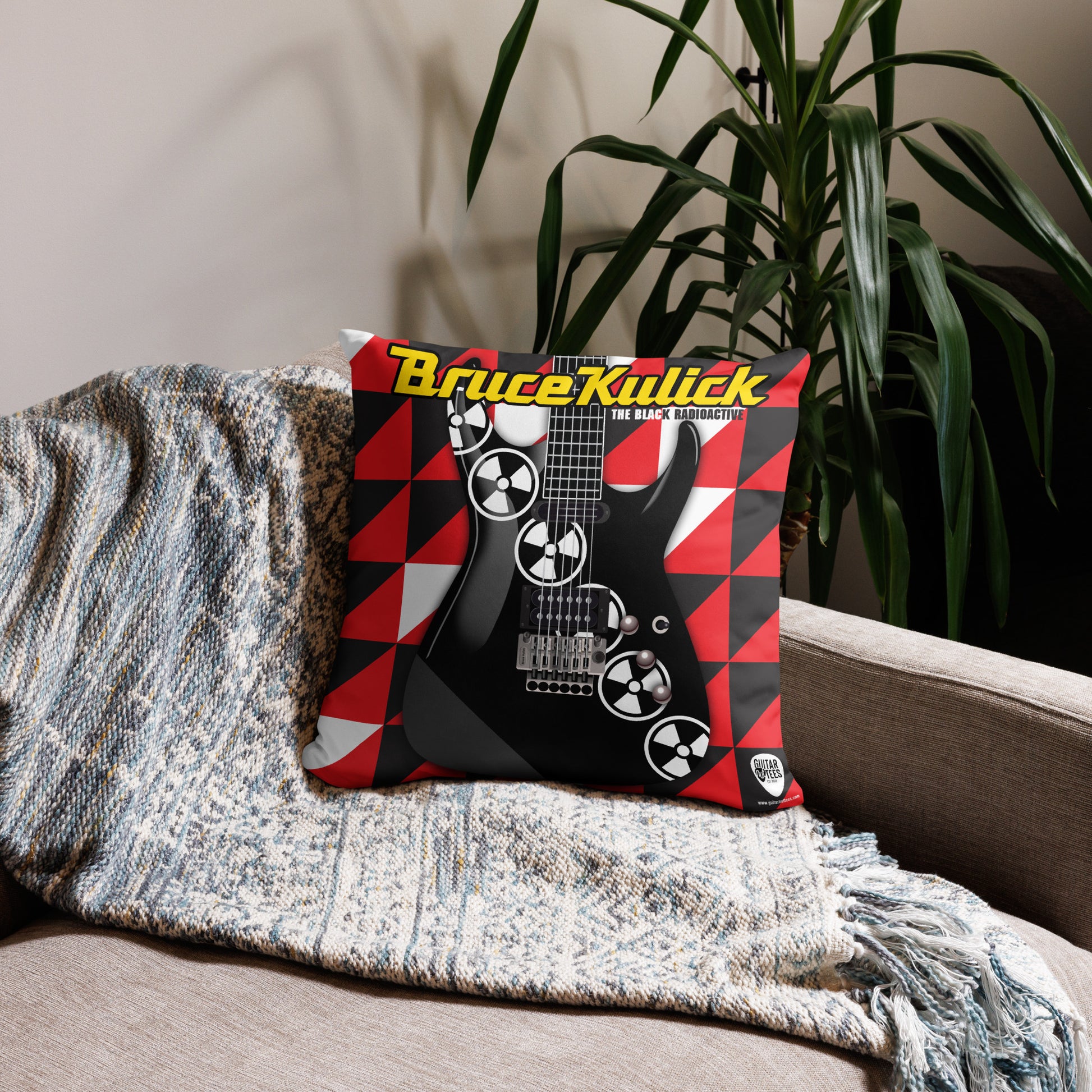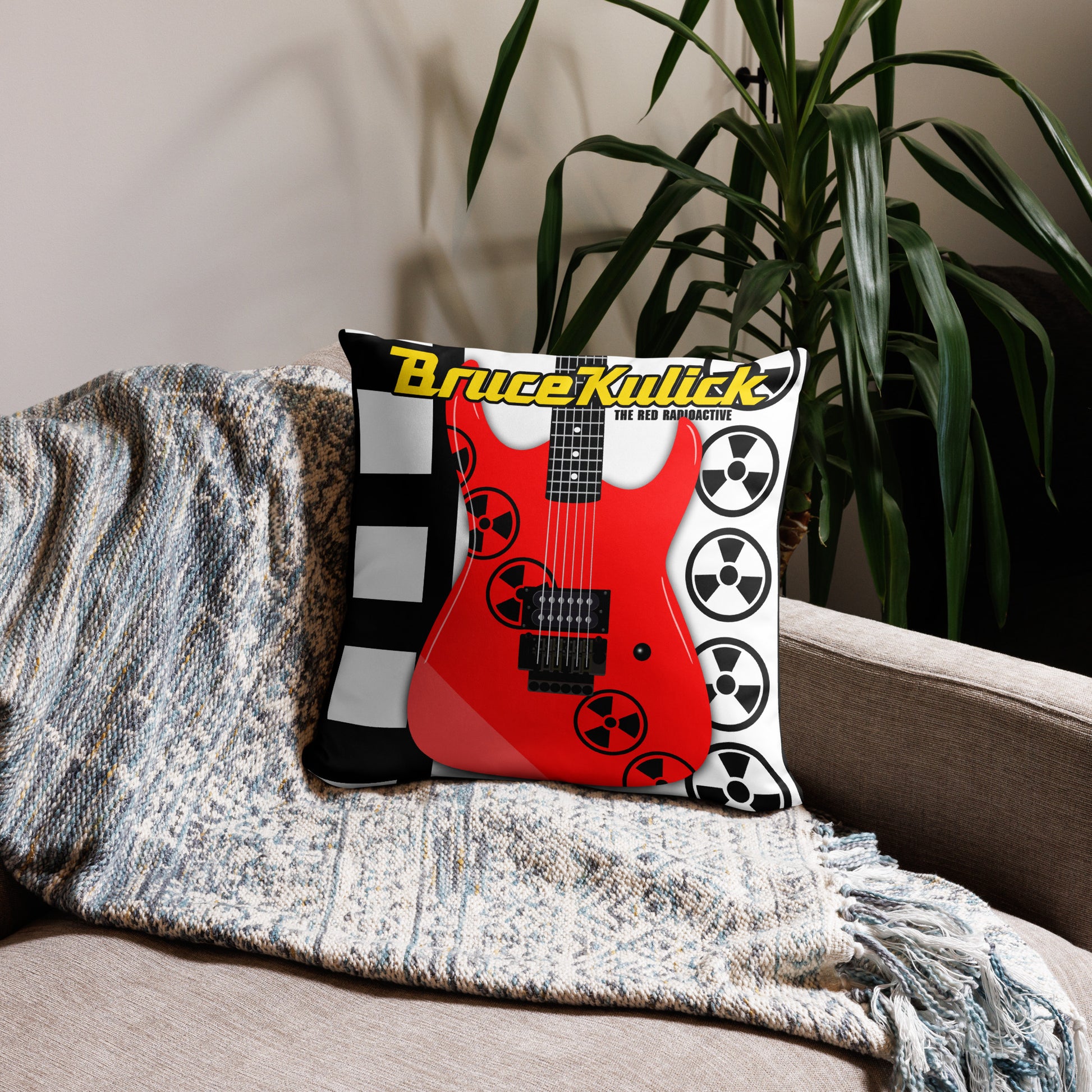 Not one, but two of Bruce's iconic Crazy Nights era guitars on one pillow! The Radioactive guitars were inspired by Bruce's iconic Radioactive suit, with its design featured on the Red guitar side. Did you know that Bruce also had another suit known as the "Flag" suit? Its triangular red, black, and white design is on the flip side behind the Black guitar. Bruce couldn’t wear the Radioactive symbol suit at every show, so the “Flag” pattern suit was his alternate outfit to perform in. It makes a great background for his Black ESP Horizon Radioactive model, featured in the “Turn On the Night” music video and onstage during the tour.