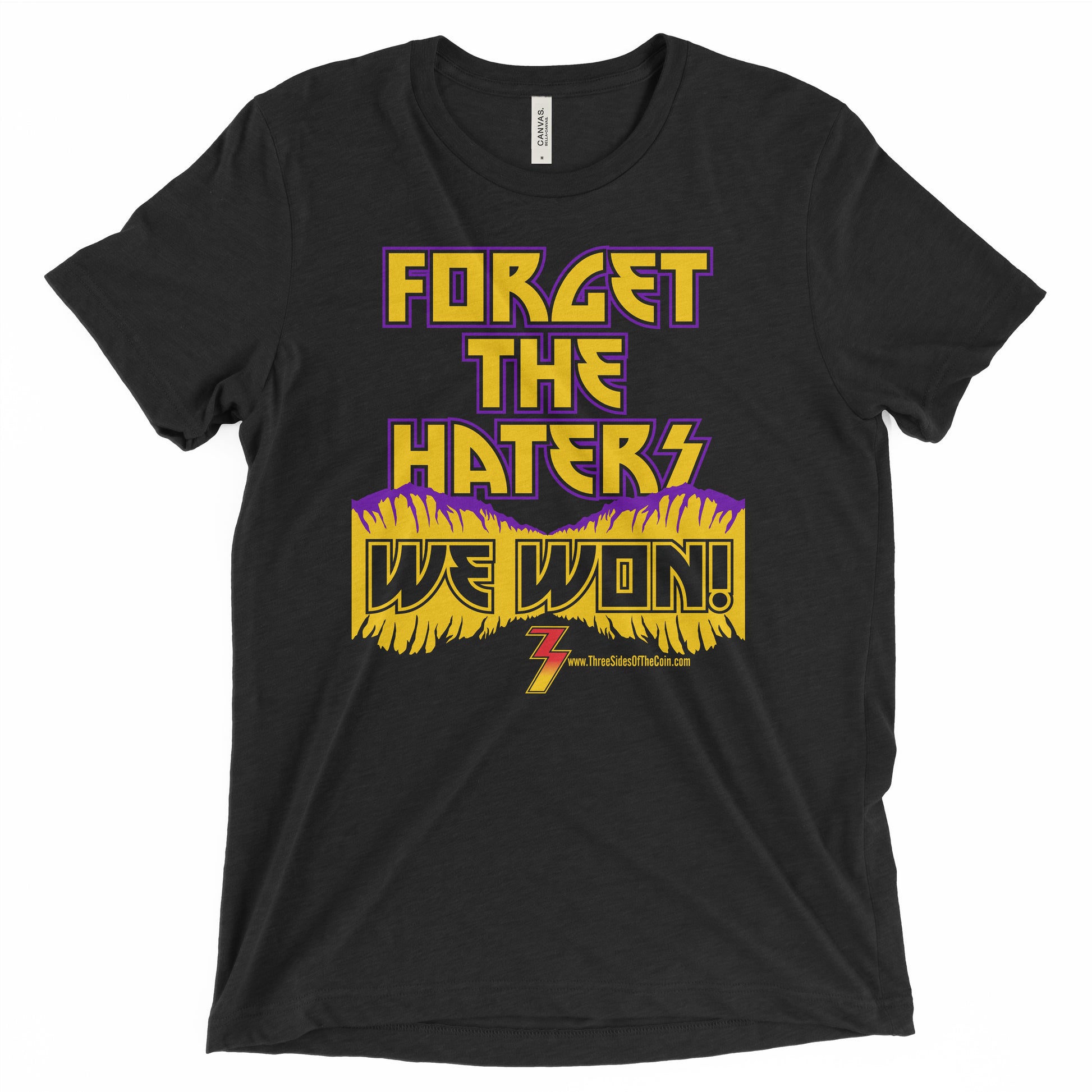 When Mark Chiccini, co-host of Three Sides of The Coin, coined the phrase 'Forget The Haters, We Won!'... he meant this: Whether it was 50 years ago or just 5, the critics, journalists, high-school bullies, disapproving parents, or anyone else who said KISS sucks, that they'd never last, they can't play, their songs are no good... here we are, still championing the band we love as they walked off into the avatar sunset on December 2, 2023 after a 50+ year multi-platinum career of sold out arenas and stadiums across the globe. We'll say it again: Forget The Haters. We WON!” Get this exclusive tee today and say it loud and proud!